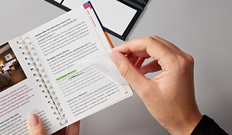Perfect for holding your thoughts without hiding the content beneath them. 200 matt-transparent adhesive notes in three sizes. Ideal for correcting and marking.